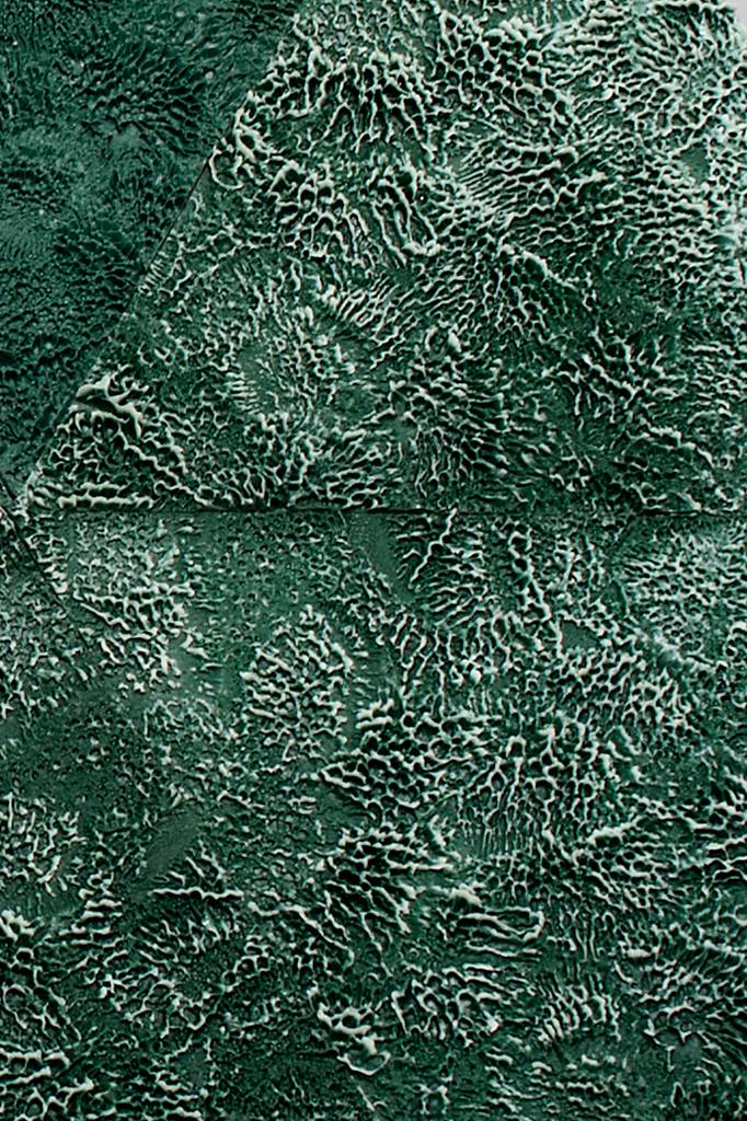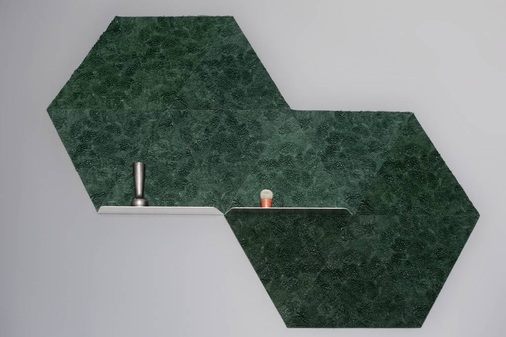 A variety of colors contrasting to white-grey can be chosen. A standard large and small model are available and custom installations are done on request. In custom designs the equilateral triangles can be mounted to the wall in various manners and amounts, creating different aesthetics and color transforming surfaces. Dynamic Geometry is designed by Jolan van der Wiel for Transnatural.
